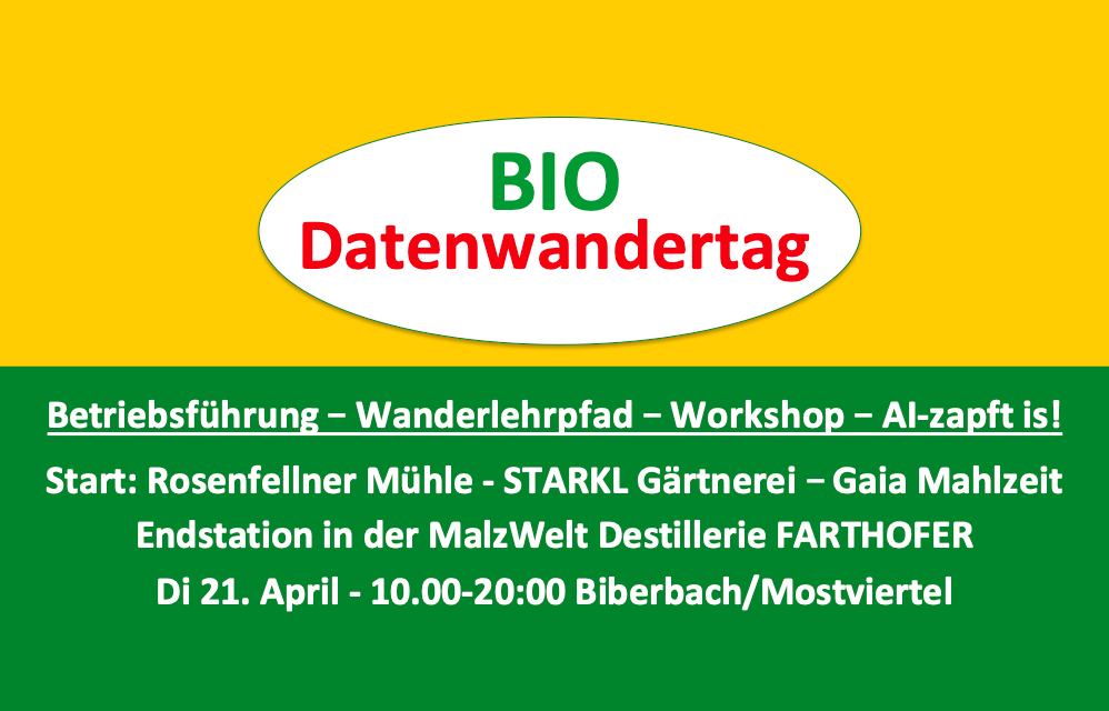 - Betriebsführung: STARKL, ROSENFELLNER, GAIA - Themenlehrpfad zu BIO&Nachhaltigkeit - Workshop DATEN IM FELDE - Whiskyverkostung BIO-Destillerie Farthofer - AI-zapft is! STAMMTISCH - Meine BIO-Daten